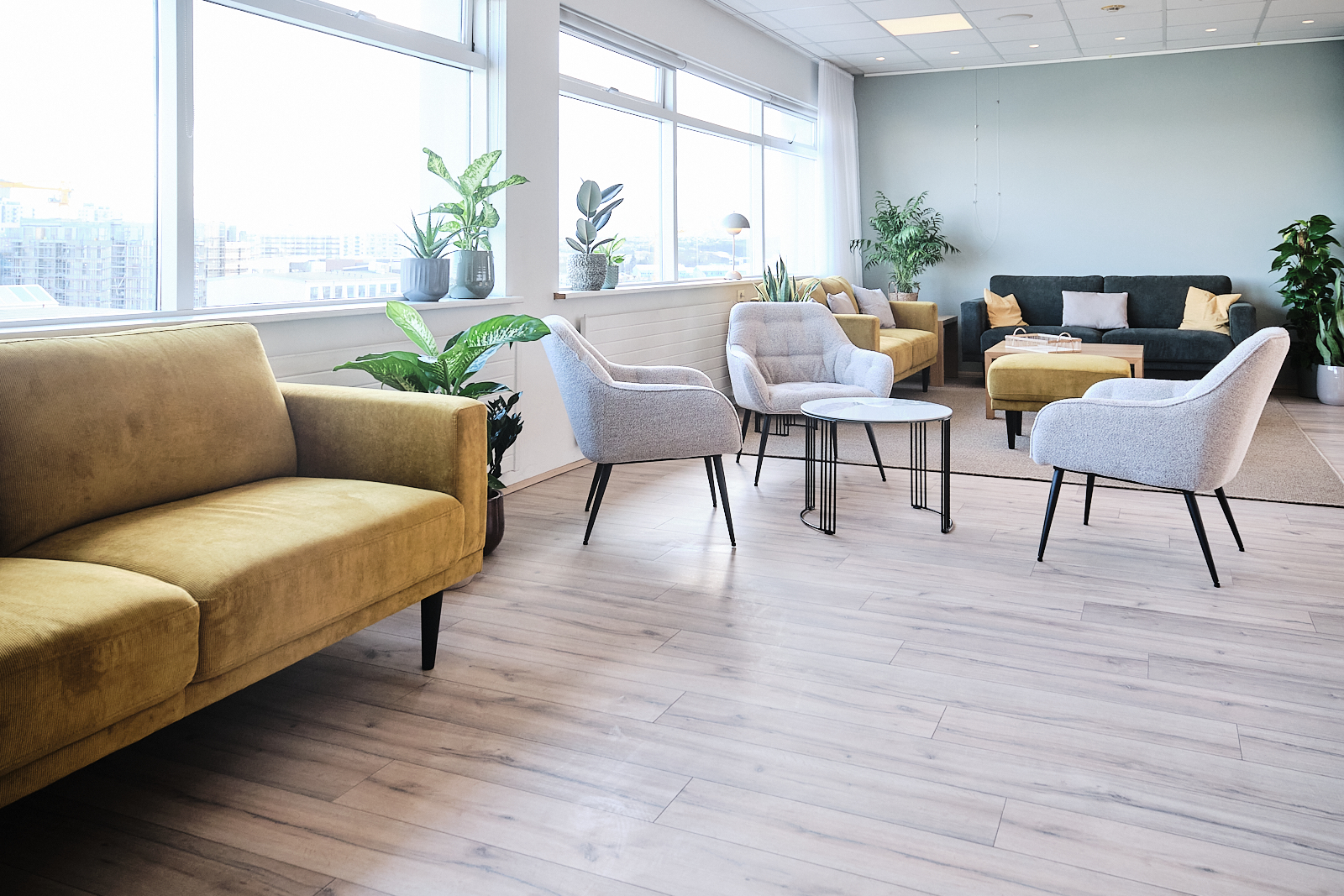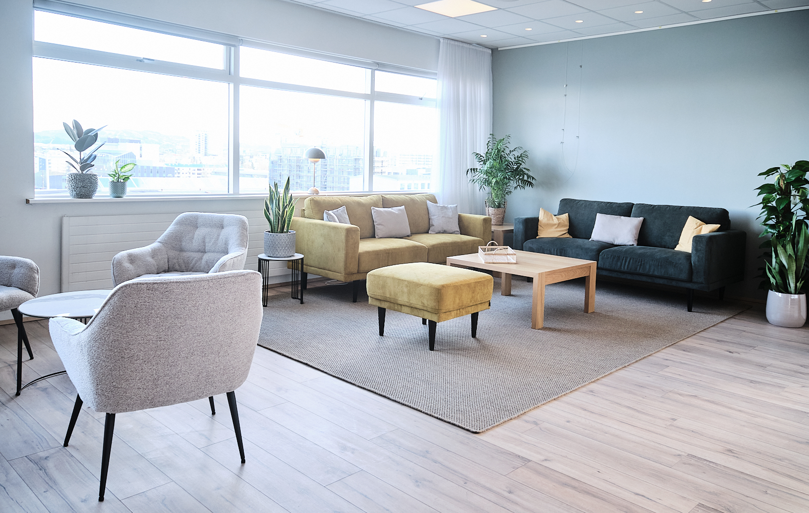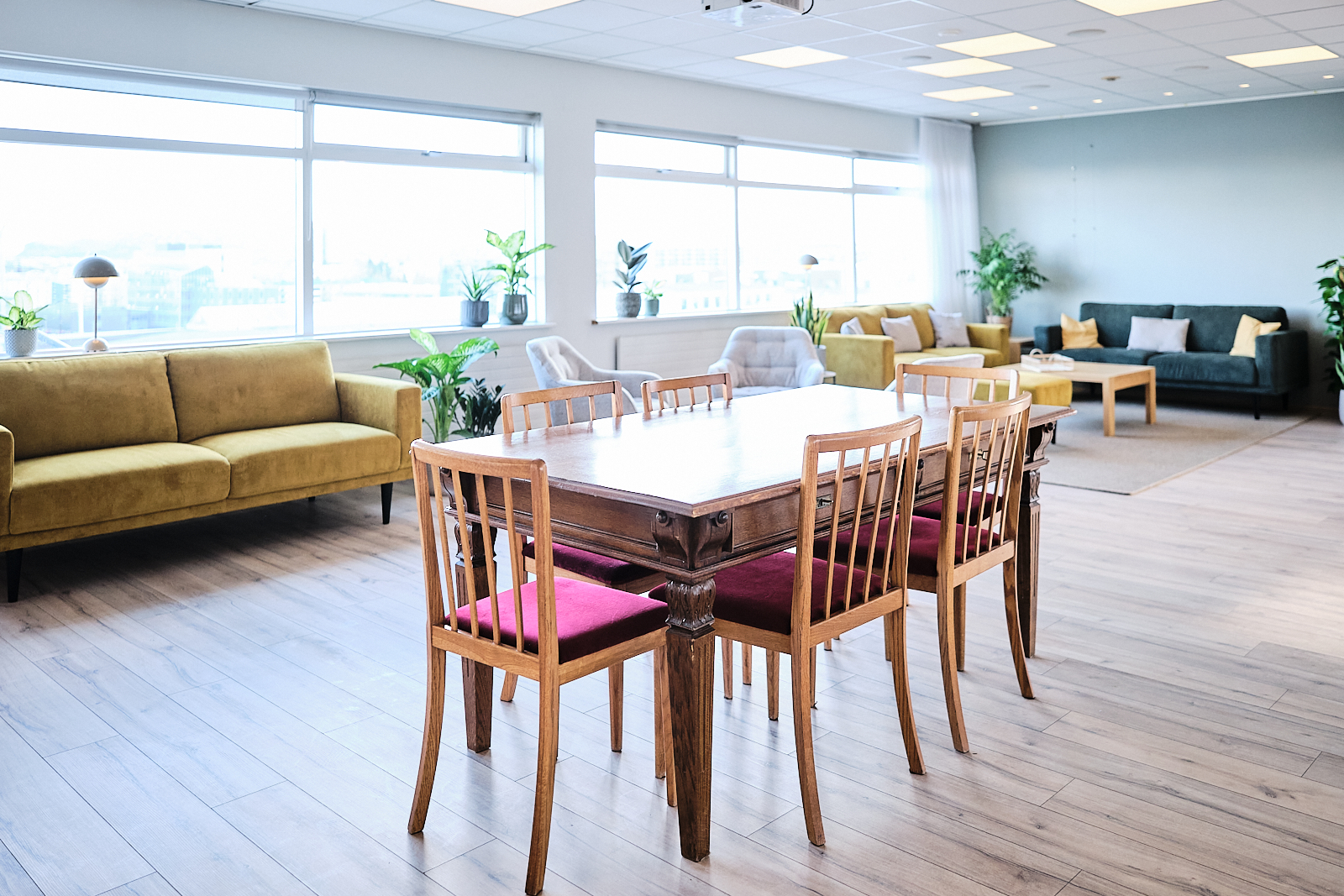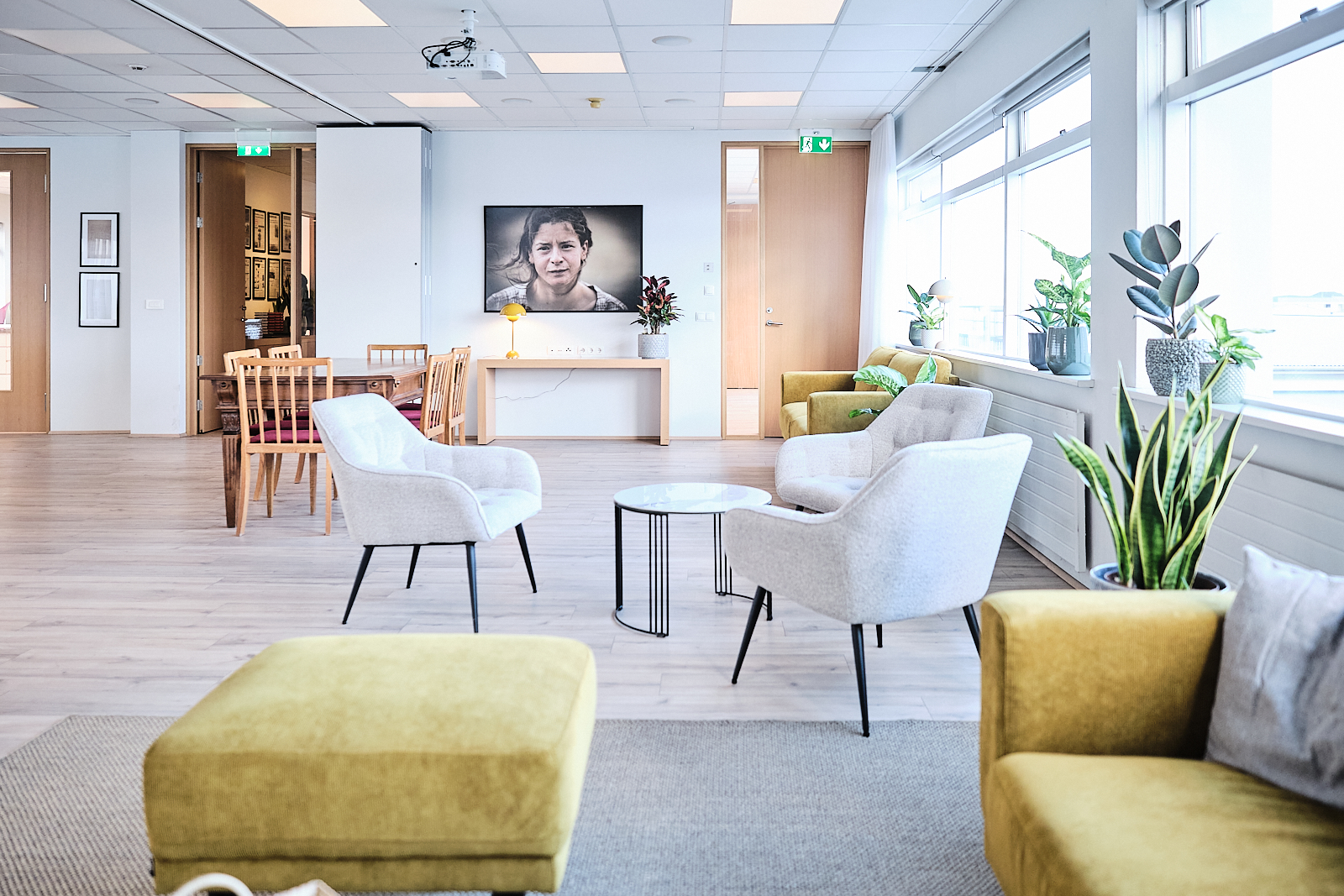 Í salnum er hljóðkerfi fyrir fundi og tveir myndvarpar. Ekki er leyfilegt að festa neitt á veggi né hengja í loft.