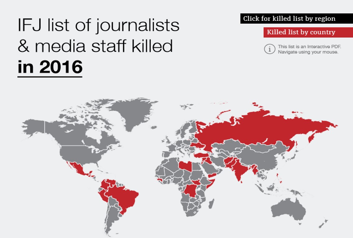 Alls voru 93 blaðamenn og annað fjölmiðlafólk drepið við störf á árinu 2016 og þar af 12 í Evrópu samkvæmt tölum sem Alþjóðasamband blaðamanna (IFJ) hefur sent frá sér. Í Evrópu voru 9 drepnir í Rússlandi, 2 í Tyrklandi og 1 í Úkraínu. IFJ hefur einnig birt sundurliðaðan lista yfir hvar þessi dráp áttu sér stað og til viðbótar þessum 93 sem á listanum eru fórust 29 í tveimur flugslysum.