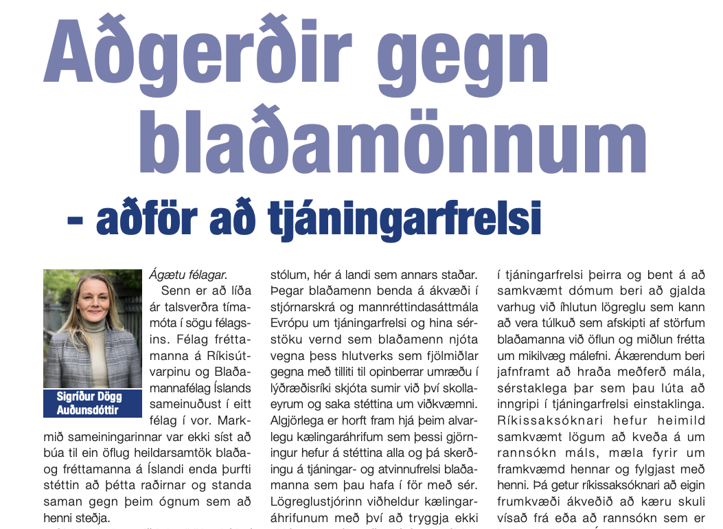 Við höfum nýlega þurft að horfa upp á fleiri dæmi þar sem atlaga er gerð að störfum blaðamanna þar sem starfsmenn Isavia beittu ljósabúnaði til að koma í veg fyrir að blaðamenn gætu sinnt störfum sínum og reyndu að hindra fréttaflutning. Blaðamannafélagið hefur lýst áhyggjum sínum af málinu og óskaði eftir fundi með ríkislögreglustjóra og forstjóra Isavia. Fundur var haldinn með ríkislögreglustjóra en forstjóri Isavia varpar frá sér ábyrgð á málinu og hefur ekki þegið boð um fund þrátt fyrir ítrekun. Málinu er því ekki lokið af hálfu félagsins enda lítum við það eftir sem áður alvarlegum augum.