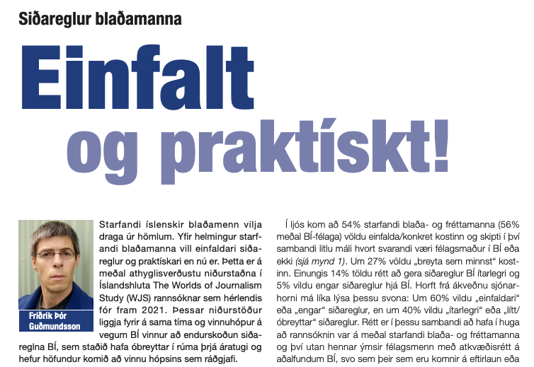 Starfandi íslenskir blaðamenn vilja draga úr hömlum. Yfir helmingur starfandi blaðamanna vill einfaldari siðareglur og praktískari en nú er. Þetta er á meðal athyglisverðustu niðurstaðna í Íslandshluta The Worlds of Journalism Study (WJS) rannsóknar sem hérlendis fór fram 2021. Þessar niðurstöður liggja fyrir á sama tíma og vinnuhópur á vegum BÍ vinnur að endurskoðun siðareglna BÍ, sem staðið hafa óbreyttar í rúma þrjá áratugi og hefur höfundur komið að vinnu hópsins sem ráðgjafi.