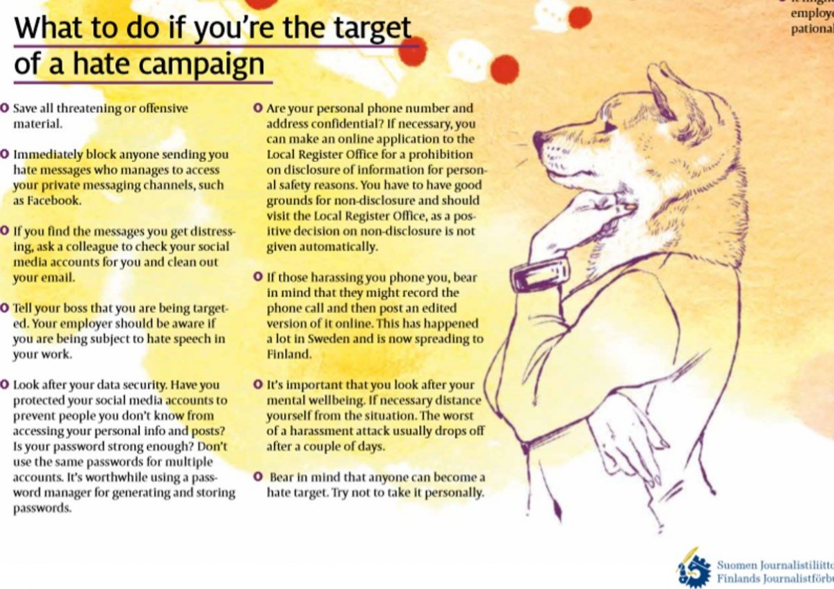 Net - áreitni gagnvart blaðamönnum er vaxandi vandamál á Norðurlöndunum og um heim allan og þessi tilhneiging er líka þekkt á Íslandi. Blaðamannafélagið í Finnlandi hefur útbúið viðbragðspakka fyrir blaðamenn sem sæta slíkum árásum, en þær eru taldar geta stuðlað að sjálfsritskoðun og þöggun blaðamanna auk þess að hafa ýmis konar neikvæð sálræn áhrif. Í þessum finnska pakka er athyglisvert plakat eða veggspjald sem finnski Blaðamaðurinn, fagrit Blaðamannafélagsins, hefur birt og útbúið í útpentanlegu formi svo menn geti hent það upp á vinnustaðnum.