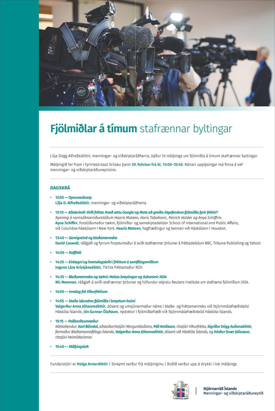 Virði frétta – hvað ættu Google og Meta að greiða útgefendum fjölmiðla fyrir fréttir? Gervigreind og blaðamennska, einlægni í fréttum og helstu tæknibreytingar og áskoranir árið 2024 er meðal þess sem fjallað verður um.