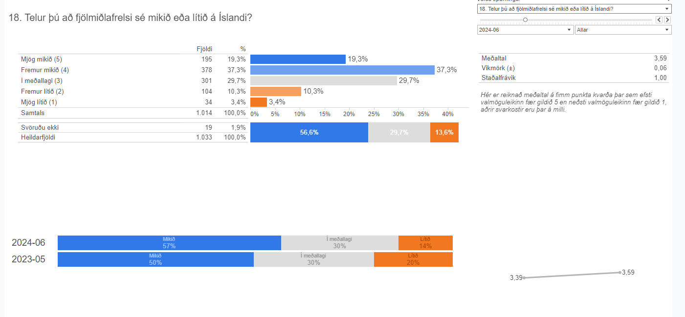 Tæplega 57% svarenda telja fjölmiðlafrelsi mikið á Íslandi samanborið við 50% í fyrra. Niðurstöðurnar eru áhugaverðar, ekki síst í ljósi þess að fjölmiðlafrelsi á Íslandi fór aftur skv. mælingum RSF, Blaðamanna án landamæra, um frelsi fjölmiðla í heiminum. Aðrar Norðurlandaþjóðir skipa efstu sæti listans en Ísland er í 18. Sæti.