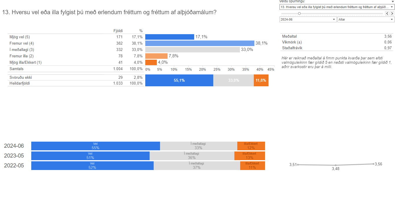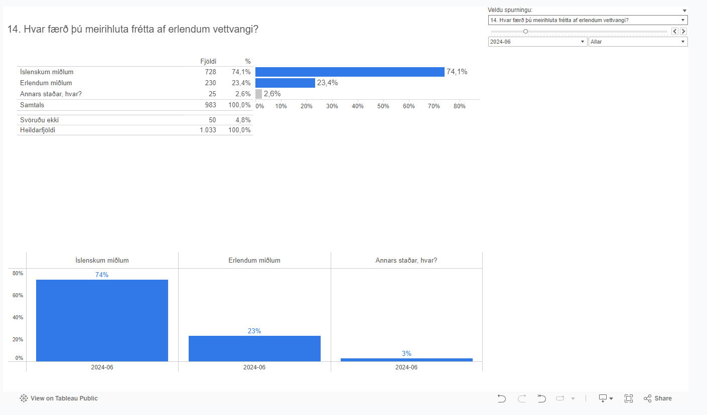 Þá segjast fleiri fylgjast með erlendum fréttum og alþjóðamálum nú en í fyrra skv. könnun Maskínu, en yfirgnæfandi meirihluti sækir þær upplýsingar í íslenska miðla um 74,1%.