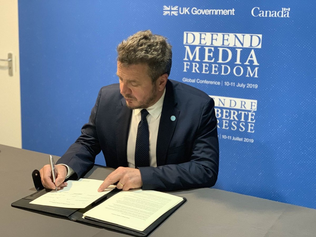 Guðlaugur Þór Þórðarson utanríkisráðherra tók þátt í ráðstefnu um fjölmiðlafrelsi sem fram fór í Lundúnum og lauk nú síðdegis. Hann tók meðal annars þátt í pallborðsumræðum um öryggi blaðamanna þar sem hann lagði áherslu á að ríki létu til sín taka á vettvangi alþjóðastofnana og auk þess undirritaði hann yfirlýsingu um fjölmiðlafrelsi. Ráðstefnan var skipulögð af breskum og kanadískum stjórnvöldum og miðar að því að efla aðgerðir til að sporna við vaxandi hættu sem steðjar að fjölmiðlafólki um allan heim.