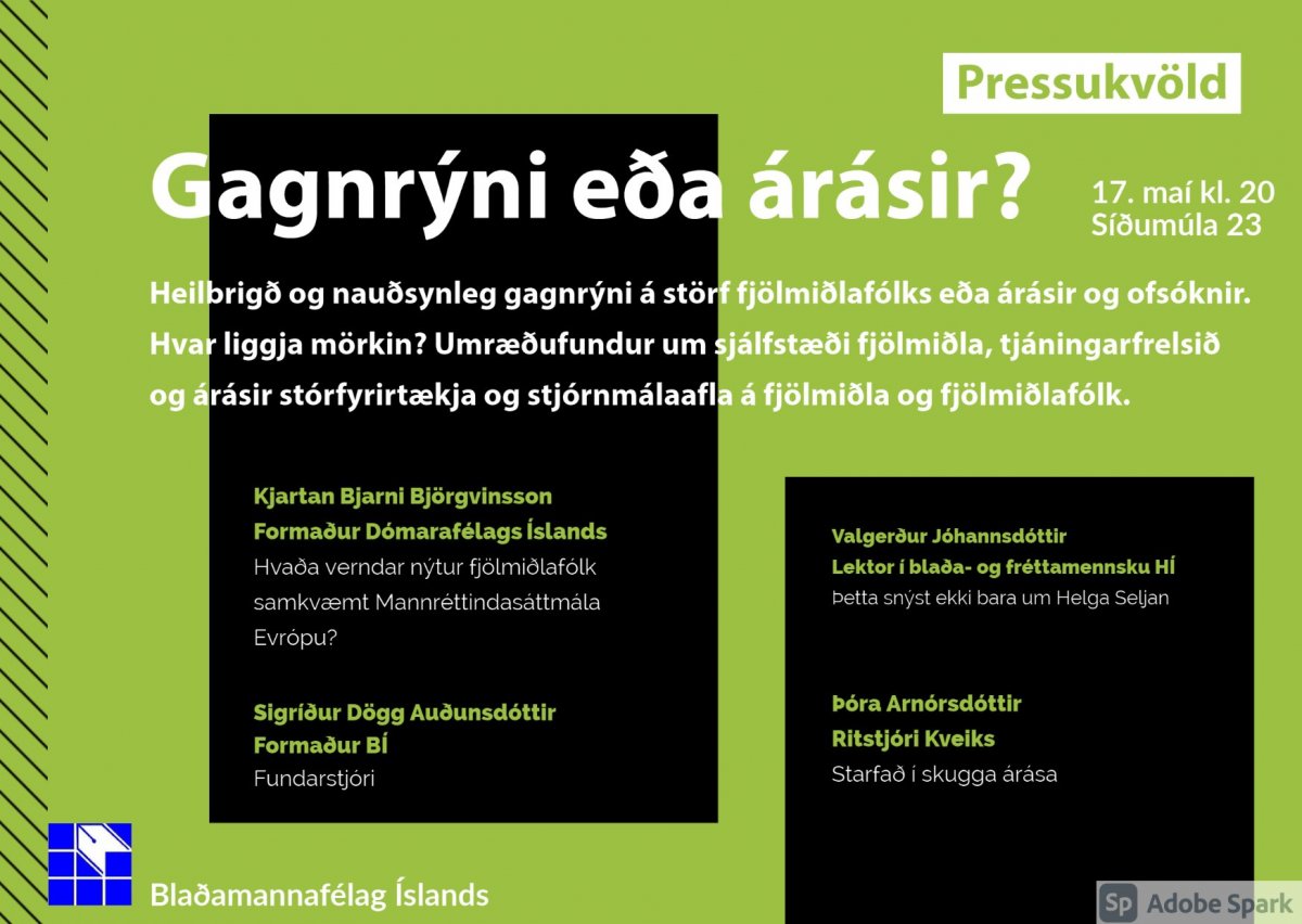 Umræðuefni kvöldsins er: Heilbrigð og nauðsynleg gagnrýni á störf fjölmiðlafólks eða árásir og ofsóknir. Hvar liggja mörkin? Umræðufundur félaga í Blaðamannafélagi Íslands um sjálfstæði fjölmiðla, tjáningarfrelsið og árásir stórfyrirtækja og stjórnmálaafla á fjölmiðla og fjölmiðlafólk.