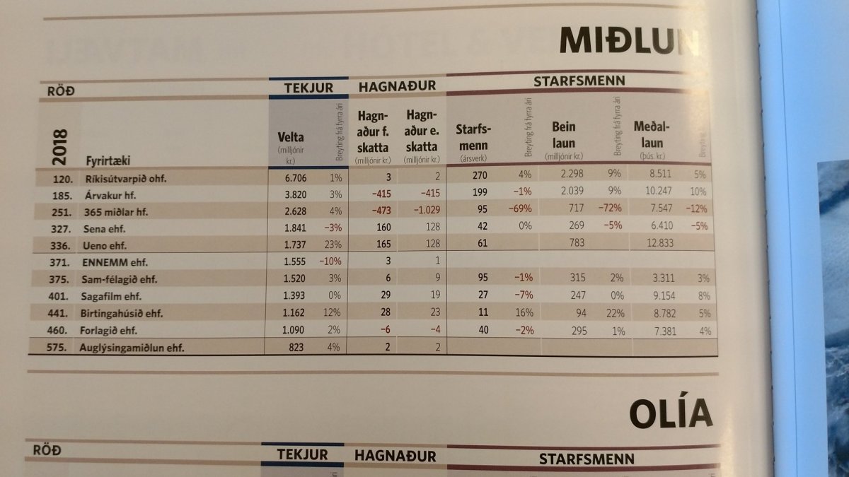 Þetta kemur fram í nýju riti 300 stærstu sem Frjáls verslun gefur út. Þar kemur fram að Ríkisútvarpið er í 120. sæti fyrirtækja í landinu þegar kemur að veltu en velta Ríkisútvarpsins nam 6,7 milljörðum króna á síðasta ári og jókst um 1%. Velta Árvakurs jókst um 3% og velta 365 miðla um 4%.