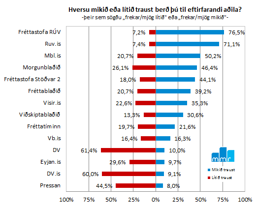 MMR kannaði á dögunum traust almennings til helstu sjónvarps-, prent- og netfréttamiðla. Af þeim fréttamiðlum sem kannaðir voru báru svarendur mest traust til fréttamiðla RÚV. Af þeim sem tóku afstöðu sögðust 76,5% bera mikið traust til Fréttastofu RÚV og og 71,1% sögðust bera mikið traust til ruv.is.