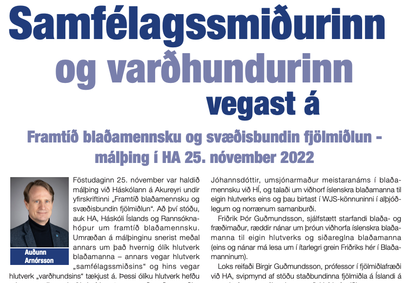 Grein eftir Auðun Arnórsson um málþingið Framtíð blaðamennsku og svæðisbundin fjölmiðlun sem haldið var í HA 25. nóvember 2022. Greinin birtist í Blaðamanninum 1/2022.