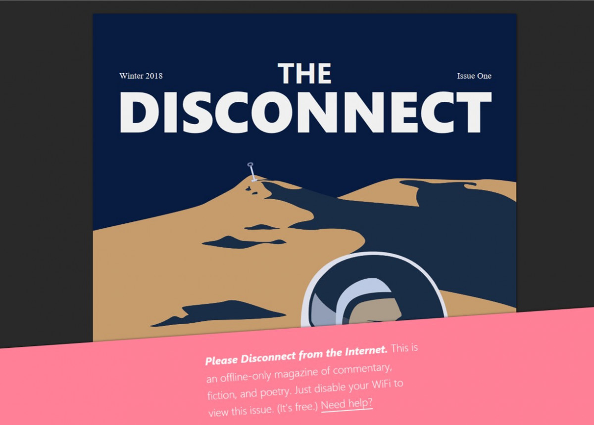 Þegar menn fara fyrst inn á síðu tímaritsins birtist upphafssíða sem líkist um margt hefðbundnu veftímariti. En þar er líka bleikur borði sem segir að men verði að aftengjast internetinu til að geta lesið blaðið! Og það er tilfellið – að þegar aftengt hefur verið birtist ýmis konar efni um samband manns og tækni, bæði greinar, fréttir og ljóð.