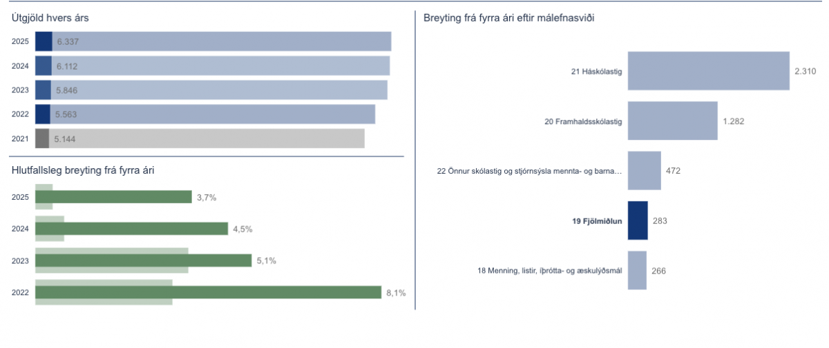 Reiknað er með að hlutfallsleg breyting á útgjöldum til fjölmiðlunar á milli áranna 2021 og 2022 sé 8,1 prósent, og að hækkunin verði 5,1% árið 2023, 4,5% 2024 og 3,7% árið 2025. Tekið er fram að í útreikningunum séu fjárhæðir áranna 2021 til 2023 reiknaðar á verðlagi hvers árs. Áætlanir áranna 2024 og 2025 séu á verðlagi ársins 2023.