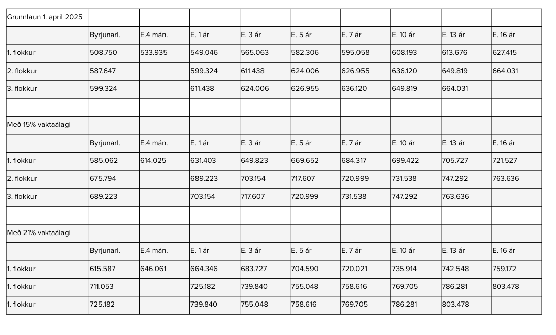 | Byrjunarlaun | Eftir 4 mánuði | Eftir 1 ár | Eftir 3 ár | Eftir 5 ár | Eftir 7 ár | Eftir 10 ár | Eftir 13 ár | Eftir 16 ár | |