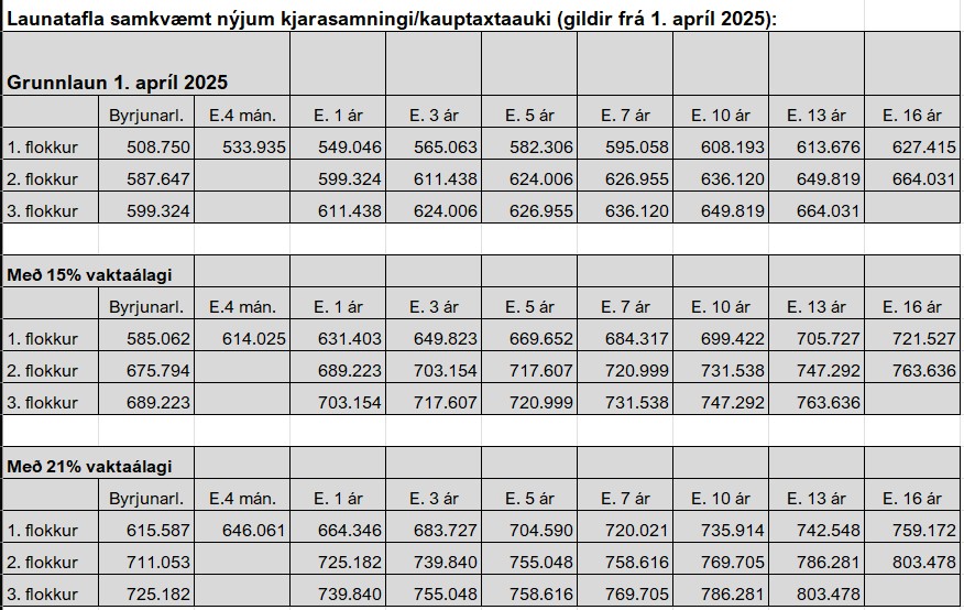 | 1. flokkur | 612.375 | 641.338 | 658.716 | 677.135 | 696.964 | 711.630 | 726.735 | 733.040 | 748.840 |